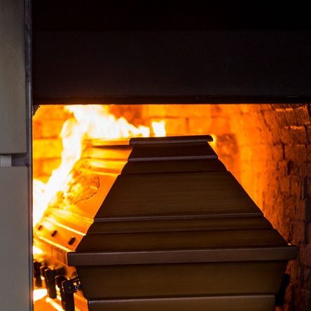 - Der Sarg wird in den Ofen gefahren, wo er sich durch die hohe Temperatur selbst entzündet.